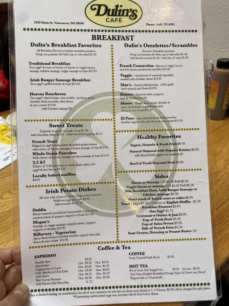 Dulin's Village Cafe, located at 1929 Main St in Vancouver, WA, is a charming eatery that embodies the spirit of community with its Latino-owned and woman-managed ethos. Catering to breakfast, brunch, and lunch lovers, this cafe serves up an array of delicious American dishes in a laid-back atmosphere. Indulge in excellent coffee, a diverse selection of teas, and local specialties, all while enjoying quick and friendly service. With options for dine-in, takeout, and delivery, plus accessible amenities, Dulin's is a welcoming spot for everyone. Come experience the delightful flavors and cozy ambiance at Dulin's Village Cafe!